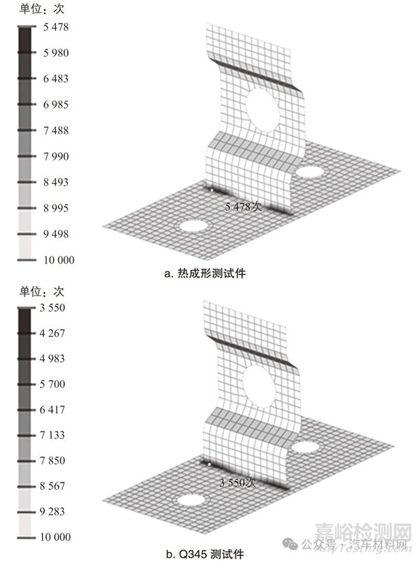疲勞仿真分析結(jié)果如圖10 所示。由圖可知,疲勞風(fēng)險區(qū)集中在焊接接頭區(qū)域靠近連接件一側(cè)。熱成形測試件的疲勞壽命為5 478 次,Q345 測試件的疲勞壽命為3 550 次,熱成形測試件的疲勞壽命較高。這主要是因為熱成形焊接接頭區(qū)域應(yīng)變較小,因此疲勞壽命較高。