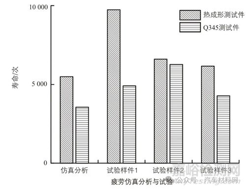 本文針對熱成形鋼與Q345 鋼之間的焊接接頭疲勞壽命進行了研究,搭建了疲勞壽命仿真分析模型,并通過樣件試驗對仿真分析結(jié)果進行了驗證,結(jié)論如下: