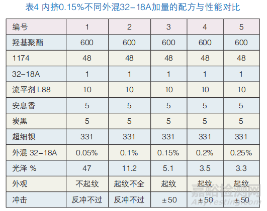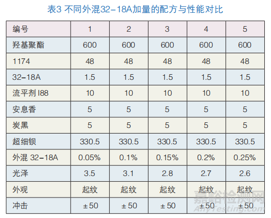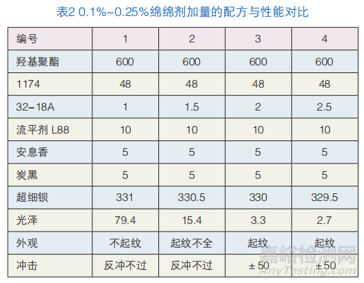 結(jié)果表明32-18A綿綿劑添加量為配方總量的0.2%時(shí)仍然起紋,低于0.2%就不出紋了。且不起紋抗沖擊能力弱,光澤高。