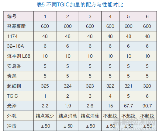 結(jié)果表明:TGIC添加量0.1%以下消除結(jié)點(diǎn)基本沒(méi)有效果,0.2%~0.3%效果明顯,0.4%以上紋路會(huì)消失,同時(shí)適量添加TGIC可以提高板面的沖擊性能。