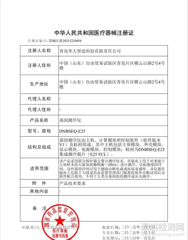 1月10日,全球第一款基于自發(fā)光測序生化原理的基因測序儀——華大智造基因測序儀DNBSEQ-E25(下文簡稱“E25”)獲批國家藥品監(jiān)督管理局(NMPA)醫(yī)療器械注冊證(國械注準(zhǔn)20253220056),被準(zhǔn)許在國內(nèi)市場應(yīng)用于臨床。這意味著,華大智造DNBSEQ基因測序儀在“激發(fā)光”與“自發(fā)光”路線均實現(xiàn)了臨床場景覆蓋,可在國內(nèi)用于臨床檢測的DNBSEQ基因測序儀也將擴充至23款。