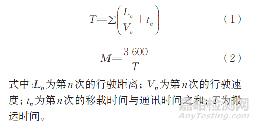 AGV的數(shù)量可以根據(jù)系統(tǒng)搬運(yùn)能力進(jìn)行配置。單位時(shí)間的搬運(yùn)次數(shù)和單次搬運(yùn)量可作為評(píng)價(jià)系統(tǒng)搬運(yùn)能力的指標(biāo)。一輛車,一個(gè)搬運(yùn)場所時(shí),每小時(shí)搬運(yùn)次數(shù)M的計(jì)算方法如式(1)和式(2)所示。