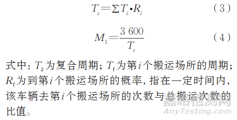 當(dāng)一輛車,i個(gè)搬運(yùn)場所時(shí),每小時(shí)搬運(yùn)次數(shù)M1的計(jì)算方法如式(3)和式(4)所示。