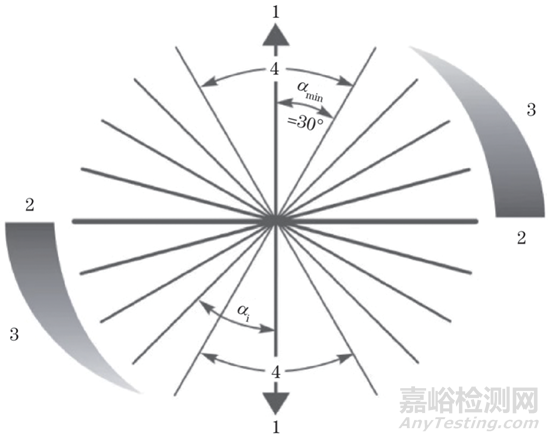 αi為磁化方向和缺陷槽之間所形成的夾角;αmin為部分磁粉檢測標(biāo)準(zhǔn)中α的最小值,取30°;1表示磁化方向;2表示最佳靈敏度;3表示靈敏度降低;4表示靈敏度不足(αmin僅是α的特例之一,αi是α的示例)