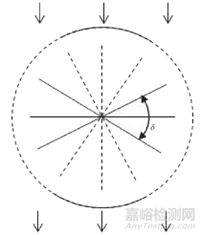 同時,多角度缺陷槽磁粉檢測試片能根據(jù)磁化后試片所有顯示磁痕的線性缺陷槽,直接測算出一次磁化有效檢出缺陷的角度范圍δ(見圖4),并由式(1)計(jì)算出最少磁化次數(shù)N以避免漏檢。
