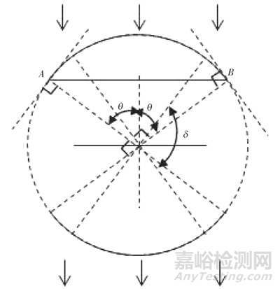 在實(shí)驗(yàn)室環(huán)境下,試片磁化后圓形缺陷槽的部分圓弧顯示磁痕,利用專門設(shè)計(jì)的方法,可確定出圓形缺陷槽的圓心,測量出顯示磁痕圓弧AB所對應(yīng)的圓心角(2θ,等于一次磁化有效檢出缺陷的角度范圍δ,見圖6),進(jìn)而計(jì)算出最少磁化次數(shù)N。