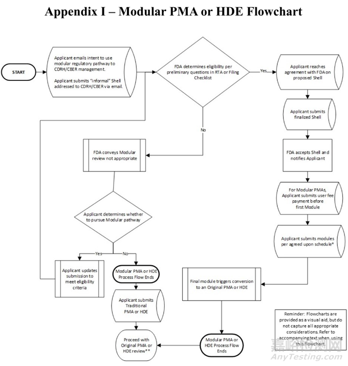 附錄I包括模塊評審中通常涉及的步驟的流程圖。第一步應(yīng)該是通過電子郵件聯(lián)系CDRH/CBER。流程圖如下: