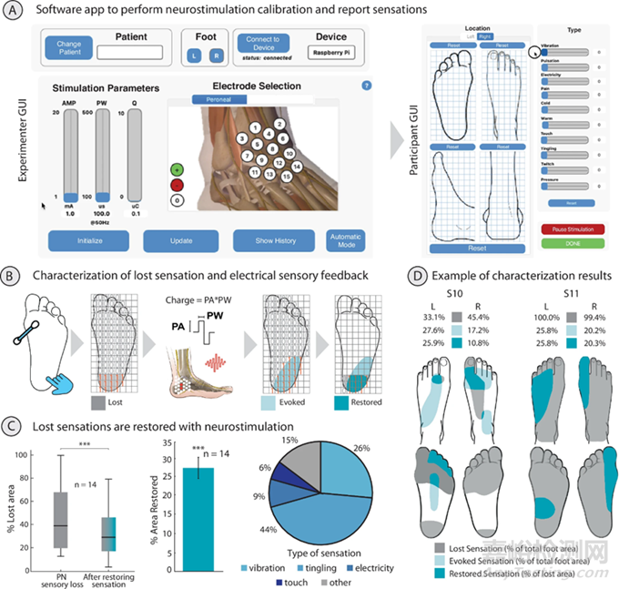 研究人員設計了一種可穿戴的感覺神經(jīng)假體(NeuroStep),通過在踝關(guān)節(jié)水平提供針對性的神經(jīng)刺激來恢復喪失的感覺。在一項可行性研究中,他們對14名周圍神經(jīng)病變受試者進行了測試,評估其在實時任務中的功能結(jié)果和疼痛,以及與引發(fā)感覺相關(guān)的皮層激活。研究人員通過在踝關(guān)節(jié)水平刺激受損神經(jīng),使用專門設計的神經(jīng)假體襪在足部不同位置提供體感投射場。他們通過心理測量客觀評估周圍神經(jīng)病變受損神經(jīng)對注入電荷的感知閾值和刺激敏感性,并將其與健康受試者的測量結(jié)果進行比較。隨后,他們測試了該神經(jīng)假體在動態(tài)恢復喪失的足部感覺和改善與日常生活活動相關(guān)的功能任務中的移動能力。為了理解這些人工恢復的感覺在大腦中的處理方式,特別是在初級體感皮層(S1)中的處理,研究人員使用了功能性磁共振成像(fMRI)。他們探討了通過在近端神經(jīng)水平進行神經(jīng)刺激恢復的體感感覺,是否激活了與直接刺激足部時相同的S1區(qū)域。最后,他們還評估了使用NeuroStep系統(tǒng)一天后報告的神經(jīng)性疼痛。