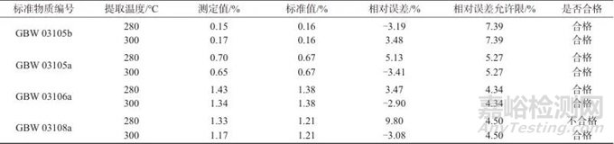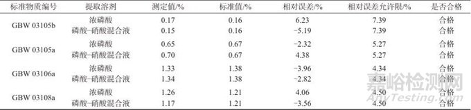 實(shí)驗(yàn)中可用于分解硅酸鹽的有效物質(zhì)是焦磷酸,當(dāng)濃磷酸的溫度為200~300 ℃時(shí),P2O5-H2O體系中以焦磷酸為主,而當(dāng)溫度過高時(shí),會(huì)產(chǎn)生偏磷酸,其腐蝕性更強(qiáng),但也易形成P2O5-SiO2難溶于水的化合物。溫度過低,會(huì)導(dǎo)致硅酸鹽分解不完全。根據(jù)以上要求,選擇了250、280和300 ℃ 3種溫度進(jìn)行試驗(yàn),結(jié)果見表4。經(jīng)驗(yàn)證,在250 ℃時(shí),可以觀察到溶液中存在部分固體,分解不完全;280 ℃時(shí)有部分測試結(jié)果不合格;溫度達(dá)到300 ℃,測試結(jié)果的相對(duì)誤差允許限均符合要求,因此選擇提取溫度為300 ℃。