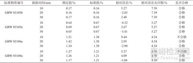 就分解硅酸鹽礦物來說,提取時(shí)間過短則溶解效果不佳,非游離二氧化硅未完全提取出來,導(dǎo)致結(jié)果不準(zhǔn)確。時(shí)間過長,生產(chǎn)效率低下。選擇10、20和30 min作為提取時(shí)間進(jìn)行試驗(yàn),結(jié)果見表5。經(jīng)試驗(yàn)驗(yàn)證,提取時(shí)間為20 min時(shí),各測試結(jié)果符合地質(zhì)規(guī)范的要求。