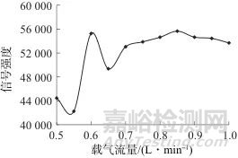 圖2 不同載氣流量時(shí)的測試元素譜線信號(hào)強(qiáng)度