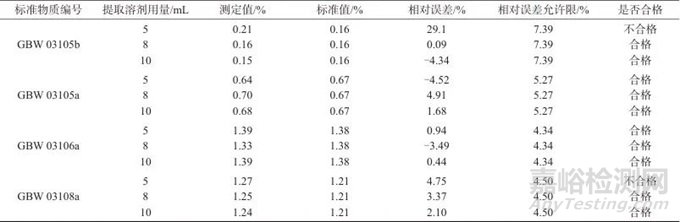 提取溶劑的用量既要保證溶礦完全,保證游離二氧化硅和硅酸鹽很好分離,又要考慮生產(chǎn)成本,從這兩方面綜合考慮,選擇了5、8、10 mL 3種提取溶劑用量進(jìn)行試驗(yàn),結(jié)果見表3。經(jīng)試驗(yàn)驗(yàn)證后發(fā)現(xiàn),采用5 mL提取溶劑溶礦時(shí),部分結(jié)果準(zhǔn)確度較低,原因是濃磷酸用量低,溶解不完全導(dǎo)致的。當(dāng)提取溶劑用量達(dá)到8 mL及以上時(shí),結(jié)果均符合要求,因此選擇8 mL作為提取溶劑用量。