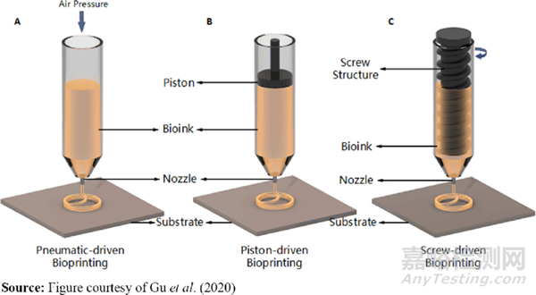 生物墨水被以細(xì)絲的形式從一個(gè)或多個(gè)噴嘴擠出,按照預(yù)定路徑逐層堆積成三維結(jié)構(gòu)。擠出過程可以通過氣動(dòng)壓力、活塞推進(jìn)或者螺桿驅(qū)動(dòng)等方式實(shí)現(xiàn)。擠出式打印適合處理較稠的生物墨水,而且可以更好地保持細(xì)胞活力,因?yàn)榧?xì)胞受到的剪切力相對(duì)較小。