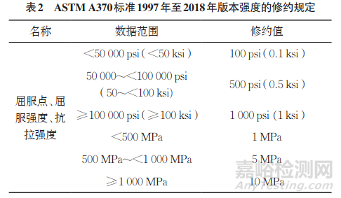 解答:關(guān)于ASTM A370標(biāo)準(zhǔn)強度單位的修約,ASTM A370-22及以前的版本都給出了英制和公制兩種單位的修約規(guī)定,但公制具體修約規(guī)定歷經(jīng)多次變化,筆者查到ASTM A370-97 至ASTM A370-18的規(guī)定如表2所示(表中1ksi=1000psi,1psi=6894.76Pa)。