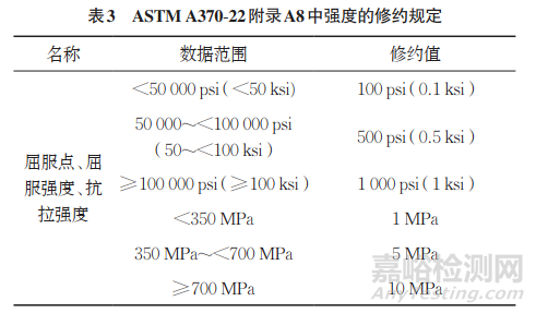 自ASTM A370-19至ASTM A370-22,公制MPa的修約發(fā)生了變化,如ASTM A370-22附錄A8中表A8.1規(guī)定如表3所示。