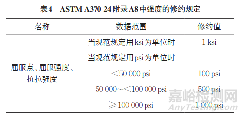 自ASTM A370-23起,ASTM A370僅給出了英制單位的修約規(guī)定,如ASTM A370-24附錄A8中表A8.1 規(guī)定如表4所示。