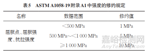 ASTM A1058-19附錄A1中關(guān)于強度公制單位修約的規(guī)定與ASTM E8/E8M標(biāo)準(zhǔn)7.13.1節(jié)的規(guī)定一致,但與ASTM A370-22相比,350~500MPa和700~1000MPa的修約值不一致。
