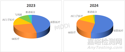 圖 3 2023 VS 2024年國內(nèi)PET-CT各品牌市場份額