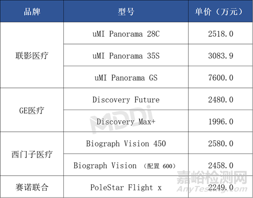 從單價來看,在國內(nèi)PET-CT主要品牌型號中,聯(lián)影醫(yī)療的uMI Panorama GS是唯一一款單價超7000萬元的PET-CT,其次聯(lián)影醫(yī)療的uMI Panorama 35S單價超3000萬元。GE醫(yī)療的Discovery Max+單價最低,單價為1996萬元。