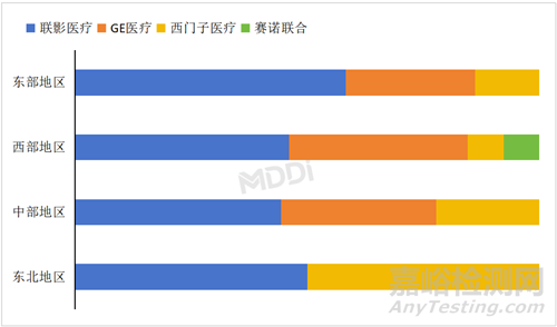 從品牌市場份額來看,聯(lián)影醫(yī)療在國內(nèi)東部、西部和中部地區(qū)均居首位,在東部地區(qū)與西門子醫(yī)療各占半壁江山;GE醫(yī)療在東部、西部和中部地區(qū)占相對優(yōu)勢,表現(xiàn)較為均衡;賽諾聯(lián)合在西部地區(qū)表現(xiàn)也不俗。