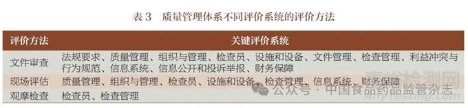 PIC/S 對(duì)藥品檢查的評(píng)估有文件審查、現(xiàn)場(chǎng)評(píng)估、觀摩檢查共3 種評(píng)估方式[8]。結(jié)合我國藥品檢查機(jī)構(gòu)工作實(shí)際,對(duì)質(zhì)量管理體系的評(píng)估可采用PIC/S 的評(píng)估方式。表3 匯總了各評(píng)價(jià)系統(tǒng)的評(píng)價(jià)方法。其中,文件審查是指對(duì)檢查機(jī)構(gòu)制定的相關(guān)制度、程序、記錄等文字材料進(jìn)行審查,審查其是否符合上位法規(guī)、技術(shù)標(biāo)準(zhǔn)和上級(jí)部門的要求,是否對(duì)國家藥監(jiān)局的相關(guān)政策制定了具體的落實(shí)措施,可以通過現(xiàn)場(chǎng)查閱或遠(yuǎn)程調(diào)取的方式開展。現(xiàn)場(chǎng)評(píng)估是指對(duì)檢查機(jī)構(gòu)的人員、設(shè)施和設(shè)備、相關(guān)活動(dòng)、原始記錄和數(shù)據(jù)等進(jìn)行進(jìn)一步現(xiàn)場(chǎng)核實(shí),評(píng)估其一致性、規(guī)范性、可追溯性。觀摩檢查是指在檢查實(shí)施的現(xiàn)場(chǎng)同步開展的評(píng)估過程,是對(duì)檢查工作特有的、高效的評(píng)估方法,既評(píng)估檢查實(shí)施的規(guī)范性,又評(píng)估檢查員的檢查能力,可以對(duì)檢查員和檢查管理的整體表現(xiàn)和績(jī)效作出評(píng)價(jià)。