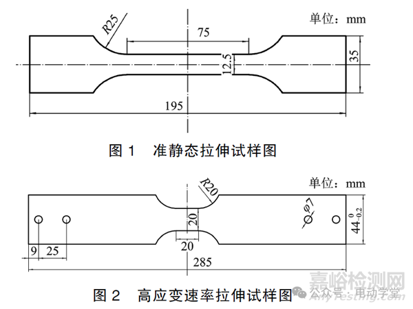 分別設(shè)計準靜態(tài)及動態(tài)拉伸試樣,準靜態(tài)拉伸試驗(應(yīng)變速率為0.001s-1)參考《金屬材料高應(yīng)變速率拉伸試驗第2部分:液壓伺服型與其他類型試驗系統(tǒng)》(GB/T228.1-2010)方法A進行,試樣尺寸如圖1所示,試驗過程中采用全場應(yīng)變測量系統(tǒng)獲取試樣變形位置的應(yīng)變。高應(yīng)變速率拉伸試驗(應(yīng)變速率為1、10、100、500s-1)參考《金屬材料拉伸試驗第1部分:室溫試驗方法》(GB/T30069.2-2016)[8]進行,試樣尺寸如圖2所示,采用DIC非接觸式測量方法進行試驗,為減小應(yīng)變率100s-1和500s-1拉伸試驗造成的振蕩,采用在樣件上粘貼應(yīng)變片的方式進行試驗。試驗結(jié)束后通過GOMCorrelateProfessional2020軟件對數(shù)據(jù)采集器采集的圖片和數(shù)據(jù)進行處理,得到試樣的應(yīng)力-應(yīng)變曲線。