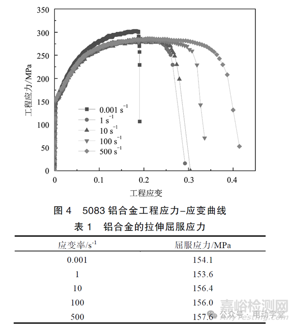 根據(jù)不同應(yīng)變速率下的單向拉伸試驗結(jié)果,選取重復度較高、振蕩較小的試驗曲線,得到如圖4所示的材料拉伸工程應(yīng)力-應(yīng)變曲線。根據(jù)結(jié)果發(fā)現(xiàn),5083鋁合金在單向拉伸時出現(xiàn)了與應(yīng)變率效應(yīng)不同的現(xiàn)象,即隨著應(yīng)變率的增加,材料的屈服應(yīng)力未出現(xiàn)明顯的直線增加或減小,如表1所示。同時可觀察到在試驗過程中出現(xiàn)了非常明顯的應(yīng)變硬化現(xiàn)象,即材料的塑性流動應(yīng)力隨應(yīng)變的增加而增加,這是典型的面心立方結(jié)構(gòu)金屬特征。