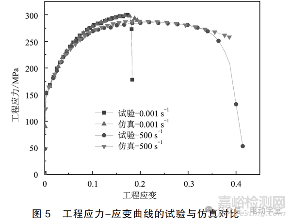 在LS-DYNA中以準靜態(tài)和應(yīng)變率500s-1的單軸拉伸試驗為研究對象,網(wǎng)格尺寸采用2.0mm,將擬合得到的外推曲線導入材料模型中進行計算,并通過對硬化準則方程參數(shù)的優(yōu)化調(diào)整,最終得到可以較好的預測5083鋁合金力學強度性能的模型,*MAT_24中各參數(shù)如表2所示,其中材料應(yīng)力應(yīng)變加載曲線采取輸入擬合曲線。計算結(jié)果如圖5所示,仿真得到的力學曲線與試驗曲線吻合度較高,驗證了優(yōu)化的S-H-S準則可較好的預測鋁合金的塑性力學行為。