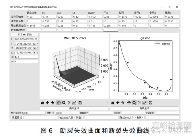 中國汽車技術(shù)研究中心自主研發(fā)的失效參數(shù)擬合系統(tǒng)V1.0可以實現(xiàn)對MMC模型的擬合,只需將應(yīng)力三軸度、洛德角系數(shù)和等效斷裂應(yīng)變值輸入軟件中,即可一鍵得到材料的失效曲面或失效曲線。