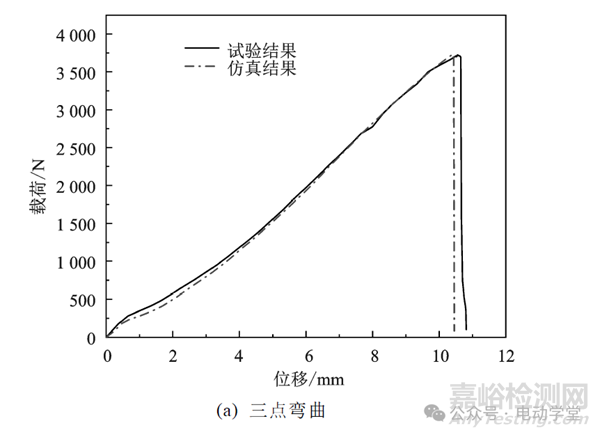 為了驗證MMC斷裂模型的準確性,對材料進行三點彎曲試驗和動態(tài)穿孔試驗。試驗中,加載速度為1m/s。根據(jù)試驗工況,建立5083鋁合金三點彎曲和動態(tài)穿孔有限元仿真模型。將上文建立的MMC模型參數(shù)輸入有限元模型中進行計算,根據(jù)仿真分析結(jié)果讀取載荷-位移曲線,將其與試驗數(shù)據(jù)進行對標,如圖9所示,結(jié)果表明吻合性較好。這說明,本文建立的斷裂模型可較為準確的預測5083鋁合金的失效,為后續(xù)電池包和整車的安全仿真分析奠定了堅實的材料數(shù)據(jù)基礎(chǔ)。