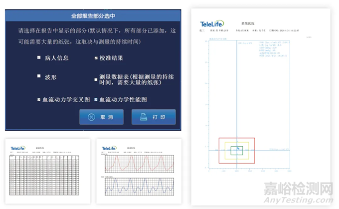 連接打印機(jī)后,醫(yī)務(wù)人員可自主選擇需要打印的項(xiàng)目,包括病人信息、校準(zhǔn)結(jié)果、波形、測量數(shù)據(jù)表、血流動力學(xué)交叉圖、血流動力學(xué)性能圖。