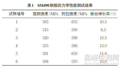 SM490鋼屬于熱軋?zhí)妓氐秃辖鸾Y(jié)構(gòu)鋼,具有良好的力學(xué)性能、焊接性能、內(nèi)在質(zhì)量和深加工性能等,是近年來(lái)廣泛使用的結(jié)構(gòu)鋼之一, 在工程建筑、機(jī)械制造等領(lǐng)域應(yīng)用廣泛。某鋼廠生產(chǎn)的SM490鋼板厚度為16mm,寬度為1500mm,與用戶(hù)簽訂協(xié)議時(shí),結(jié)合標(biāo)準(zhǔn),要求其屈服強(qiáng)度大于330MPa,抗拉強(qiáng)度為500~620MPa,斷后伸長(zhǎng)率大于17%。在對(duì)鋼板進(jìn)行力學(xué)性能測(cè)試過(guò)程中,發(fā)現(xiàn)其斷后伸長(zhǎng)率全部不合格,試樣1,5的抗拉強(qiáng)度不合格(見(jiàn)表1)。筆者對(duì)力學(xué)性能不合格的試樣進(jìn)行一系列理化檢驗(yàn),并提出了改進(jìn)措施,以避免該類(lèi)問(wèn)題再次發(fā)生。
