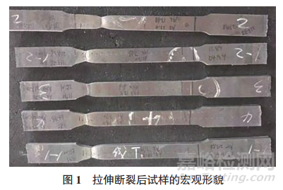 對(duì)拉伸斷裂后的試樣進(jìn)行宏觀觀察,結(jié)果如圖1所示。由圖1可知:試樣均斷裂于平行段端部靠近試樣雙肩的位置,斷裂位置異常。