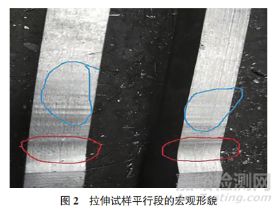 拉伸試樣平行段的宏觀形貌如圖2所示。由圖2可知:試樣中存在明顯的溝槽、臺(tái)階等加工缺陷。拉伸試驗(yàn)時(shí)加工缺陷處產(chǎn)生應(yīng)力集中。