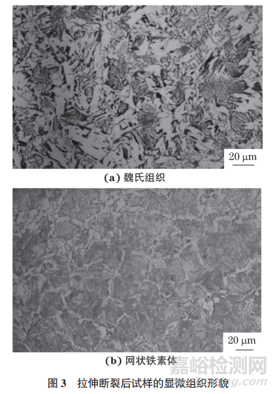 拉伸斷裂后試樣的顯微組織形貌如圖3所示。由圖3可知:試樣主要組織為鐵素體+ 珠光體,但鐵素體呈方向不規(guī)則、寬度及長(zhǎng)度不相等的針狀,可見(jiàn)明顯的魏氏組織和網(wǎng)狀鐵素體。魏氏組織和網(wǎng)狀鐵素體會(huì)使金屬材料的塑性變差。