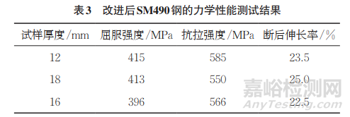 采用改進(jìn)后的工藝生產(chǎn)SM490鋼,對(duì)改進(jìn)后的SM490鋼進(jìn)行力學(xué)性能測(cè)試,結(jié)果如表3所示。由表3可知:改進(jìn)后SM490 鋼的力學(xué)性能均合格,與改進(jìn)前的SM490鋼相比,改進(jìn)后SM490鋼的強(qiáng)度變小,且力學(xué)性能較穩(wěn)定。