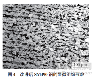 改進(jìn)后SM490鋼的顯微組織形貌如圖4所示,試樣組織為正常的熱軋鐵素體+均勻分布的珠光體。