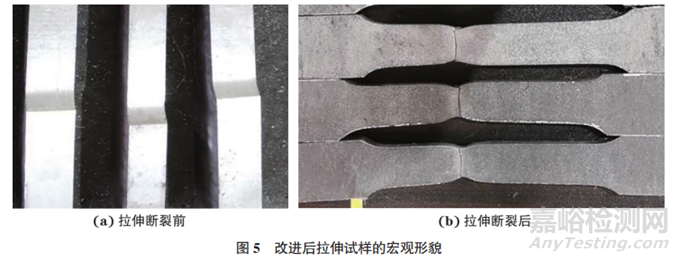 改進(jìn)后拉伸試樣的宏觀形貌如圖5所示。由圖5可知:試樣平行段無(wú)溝槽、臺(tái)階等加工缺陷,且表面粗糙度較小,拉伸斷裂位置也都靠近平行段中部區(qū)域。