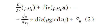 其中,ρ 為密度,kg/m3;t 為時間,s;u 是速度矢量,m/s ;p 是流體微元體上的壓力,N ;μ 是動力黏度,N · s/m2 ;Su 是源項;i 為x,y,z。