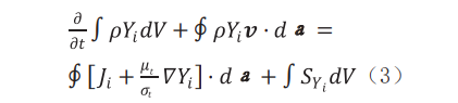 其中,t 為時間,s ;V 為體積,m3 ;а 為面積矢量,m2 ;i 為組分指數(shù);ρ 為總體密度,kg/m3 ;ν 是速度,m/s ;ut為湍流動力粘度;σt 為湍流施密特數(shù);SYi為指定區(qū)域源項;Ji為層流擴散通量。