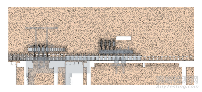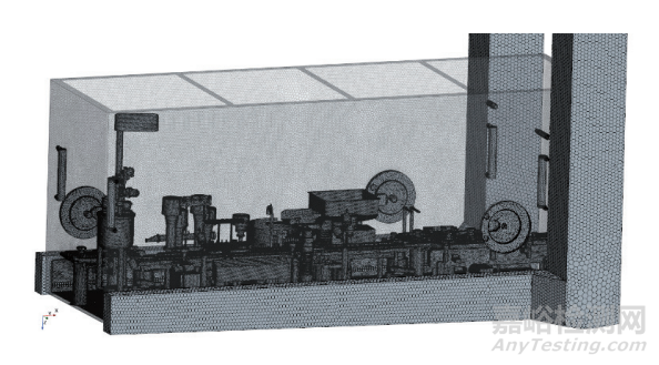 網(wǎng)格模型是 CFD 仿真模擬與分析的載體,其質(zhì)量直接影響 CFD 的計算精度和計算效率。網(wǎng)格可分為結(jié)構(gòu)化和非結(jié)構(gòu)化兩大類,結(jié)構(gòu)化網(wǎng)格主要是六面體、多面體網(wǎng)格單元,非結(jié)構(gòu)化網(wǎng)格包括四面體和五面體網(wǎng)格[4]??紤]到整個無菌灌裝設(shè)備幾何模型十分復(fù)雜,模型采取多面體網(wǎng)格劃分方式,可以大大提高網(wǎng)格劃分質(zhì)量和計算效率。計算模型的總網(wǎng)格數(shù)約為 588 萬,如圖 3 所示。此外,為了提高充氮區(qū)域分析結(jié)果的準(zhǔn)確性,對前后充氮裝置、充氮針、西林瓶內(nèi)部進行局部網(wǎng)格細(xì)化,細(xì)化后的充氮區(qū)域縱截面(XZ 平面,過西林瓶中心)網(wǎng)格模型見圖 4。