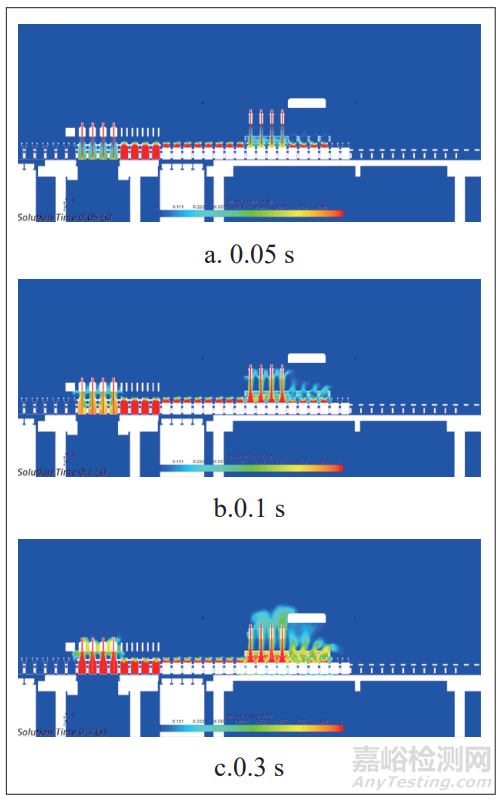 圖 6 為前后充氮裝置局部速度分布矢量圖,從矢量圖可以看出,氮氣以較高速度由充氮針進入西林瓶內(nèi),在瓶底、液面及瓶身的阻擋作用下,氣流在靠近瓶底或液面處產(chǎn)生明顯的渦流,并最終由瓶口流出,從而在短時間內(nèi)達(dá)到將瓶內(nèi)氧氣置換的效果。另外,綜合圖 7、圖8、圖 9 可以得出,充氮持續(xù)約 0.3 s,前后充氮工位瓶中氮氣占比均為 1(紅色),達(dá)到充滿的狀態(tài),保證了瓶中零殘氧量。另外由瓶內(nèi)氮氣變化曲線可以得出,前期氮氣濃度快速升高,隨著瓶內(nèi)氮氣含量的升高,氮氣濃度變化越來越慢。