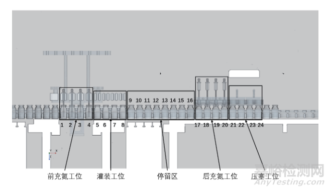 采用三維仿真分析軟件 STAR CCM+對研究對象進行計算分析,計算模型所取的邊界條件為隔離器腔體頂部定義速度入口邊界,流速 0.45 m/s,每組充氮裝置共 4 個充氮針,充氮流量為 80 L/min,充氮系統(tǒng)入口定義流量邊界條件。此設(shè)備針對 10 mL 西林瓶可實現(xiàn) 120 瓶 /min的灌裝需求,裝液量高度為 33 mm(距瓶底)。圖 5 是工位布置示意圖,其中前充氮、灌裝、后充氮、壓塞工位停留時間均為 2 s,灌裝到后充氮工位(即稱重及最小化損失區(qū)域)停留時間為 4 s,基于此工況對整個模型進行瞬態(tài)模擬分析。