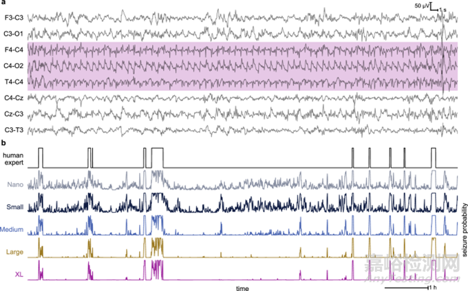 (a)中的 EEG 樣本對(duì)應(yīng)于(b)中第一次癲癇發(fā)作事件的前 60 秒。不同規(guī)模的模型(即微型、小型、中型、大型和超大型 (XL) 模型)變得更加可信,可以抑制非癲癇發(fā)作期的輸出,同時(shí)在癲癇發(fā)作期保持高度一致性。這種易于解釋的特性將有利于使用實(shí)時(shí)模型輸出跟蹤的臨床實(shí)施。