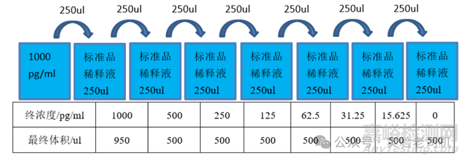 (1)用PBS緩沖液或試劑盒配置的標準品稀釋液對標準品進行溶解濃度為1000pg/ml,然后根據(jù)實驗需求進行稀釋,通常會得到6~8個不同濃度(1000、500、250、125、62.5、31.25、 15.625、0 pg/ml)的標準品溶液。稀釋倍數(shù)一般根據(jù)標準品的初始濃度和實驗的檢測范圍來確定。通常地,稀釋的標準品不得重復使用,未用完的標準品應按照一次用量分裝后,將其放在-20~-70℃貯存,一次性使用,避免反復凍融。