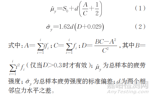在不同應力水平下按照試樣“失效”或“非失效”的計算頻率安排試驗數(shù)據(jù),僅對“失效”和“非失效”事件進行統(tǒng)計。首先將應力水平按升序排序,S0≤S1≤…≤ Sl(l為應力水平數(shù)),指定事件數(shù)fi(i=1,2,3,…),指定應力臺階Δσ,對最少的觀測數(shù)進行分組,最終獲得疲勞強度。疲勞強度統(tǒng)計方法如式(1),(2)所示。
