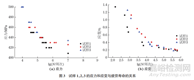 和應變與疲勞壽命的關系如圖3所示。由圖3可知:試樣2較試樣1的疲勞強度提高了17 MPa,占比為4%,試樣3較試樣1的疲勞強度提高了25MPa,占比為6%;在lgN為4.5的高應力區(qū),隨著碳元素含量的增加,3個試樣的應力不斷增大,分別為450,460,470MPa;在lgN為5.2的中應力區(qū),3個試樣的疲勞壽命最接近;在低應變區(qū),相同應變水平下,3個試樣的疲勞壽命較接近;在中高應變區(qū),相同應變水平(1.5%)下,試樣2的疲勞壽命比試樣1 延長了27%,試樣3的疲勞壽命比試樣1延長了21%。