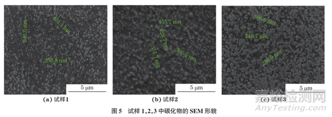試樣1,2,3中碳化物的SEM形貌如圖5所示。由圖5可知:碳化物在基體中的分布較為均勻,隨著碳含量的增加,碳化物體積分數(shù)增大,碳化物顆粒逐步粗化,尺寸為393~672nm。