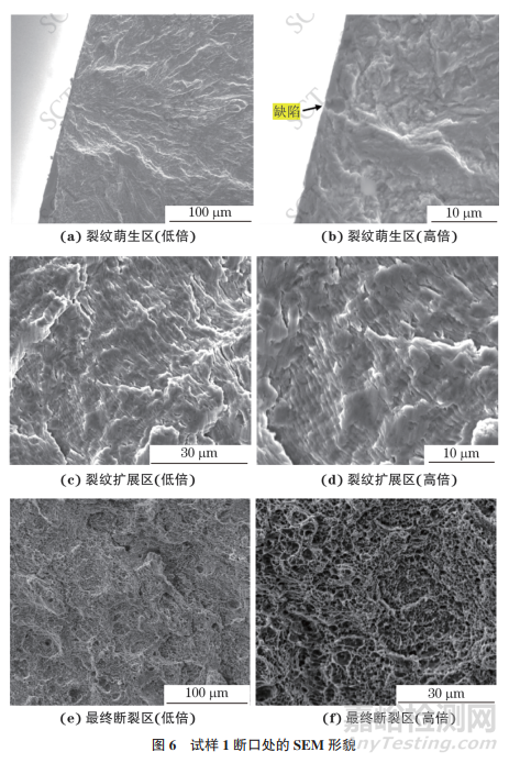 3個試樣的斷裂形式一致,其中試樣1斷口處的SEM形貌如圖6所示。由圖6可知:裂紋從試樣表面開始萌生,裂紋萌生位置為幾何缺陷或者材料本身含有的非金屬夾雜處,裂紋萌生區(qū)比較光滑,且裂紋呈輻射狀擴展;裂紋不斷擴展進入較為粗糙的條狀物區(qū)域,試樣最終在快速剪切過程中迅速斷裂;最終斷裂區(qū)損傷面非常粗糙,且有很多微裂紋、酒窩狀以及蜂窩狀組織出現(xiàn),甚至還出現(xiàn)了明顯的組織剝落現(xiàn)象。由于碳元素含量增加,材料的脆性增大,在高周疲勞范圍內(nèi),材料具有更好的疲勞性能,疲勞強度增大。在應變疲勞范圍內(nèi),中等碳元素含量的疲勞壽命最長。