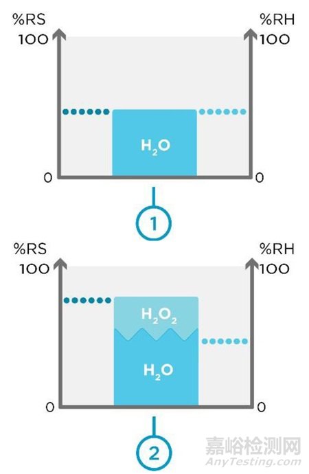 圖1顯示了兩個(gè)不同的空間:空間1沒有H2O2蒸汽,空間2有H2O2蒸汽。當(dāng)不存在 H2O2 蒸汽時(shí),相對(duì)飽和度等于相對(duì)濕度。這在空間1中可以看到。在空間2中,我們?cè)谙嗤w積的空氣中注入了H2O2蒸汽?,F(xiàn)在,相對(duì)飽和度高于相對(duì)濕度
